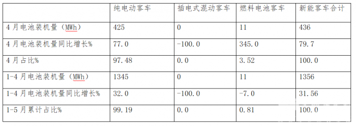 一、4月新能源客车装车量436MWh,同比增长79.7%;纯电动客车领涨领跑;1-4月新能源客车累计装车量1356 MWh,累计增长31.56%,纯电动领涨领跑