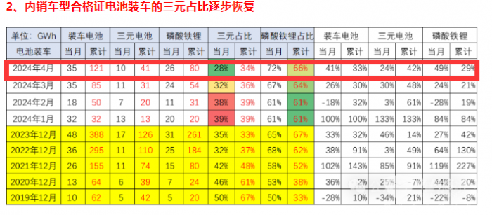 表2,根据终端上牌数据,2024年4月及1-4月新能源客车各类电池装机量及占比统计: