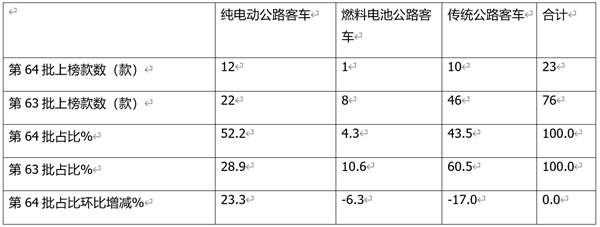 表1,第64批交通部达标车型公告上榜的各动力车型数量、占比与上一批环比(数据来源:交通部)
