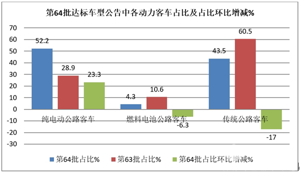 正是上述诸多因素的综合作用,导致车企积极申报纯电动公路客车达标车型,从而使得纯电动公路客车在第64批公路客车达标车型公告中主要主体地位,且占比环比增加最多。