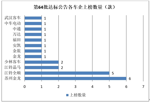 上表说明,在第64批交通部上榜达标道路运输客车车型中: