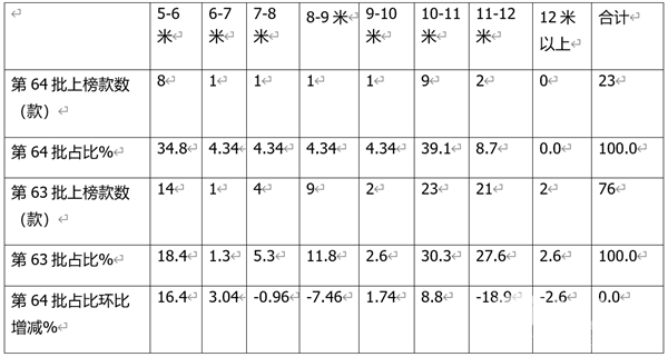表3,根据交通部数据,第64批客车达标车型公告中上榜的各长度段车型数量、占比比及环比增减统计: