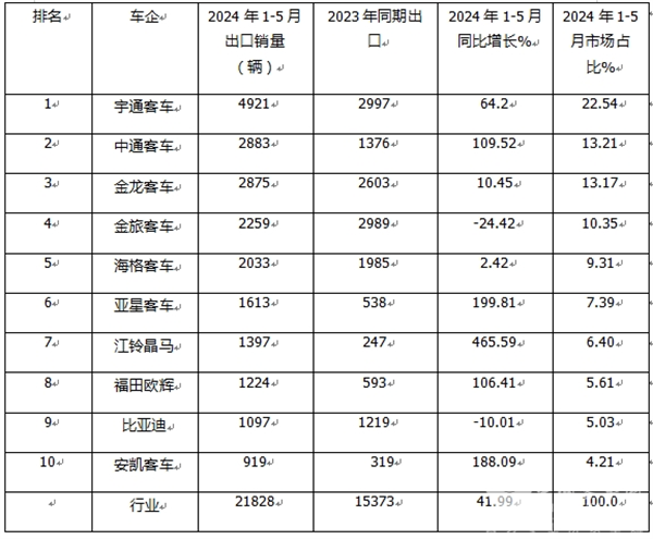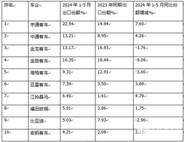 表2,根据中国客车统计信息网数据,2024年1-5月客车企业整体出口TOP10排行(不含轻客出口数量):