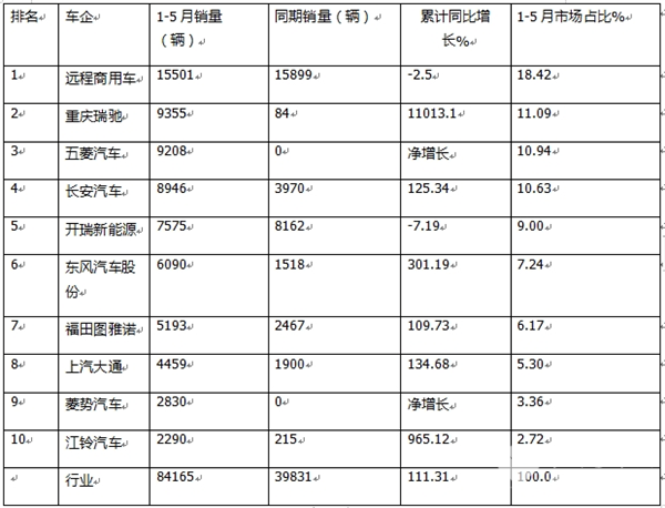上表显示,在2024年1-5月新能源轻客累计销量中:
