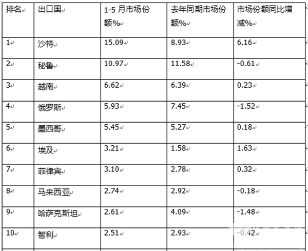 ---秘鲁市场占比10.97%,居第二,占比同比减少0.61个百分点;
