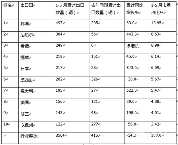 四、5月新能源客车出口:韩国、以色列、墨西哥居前三