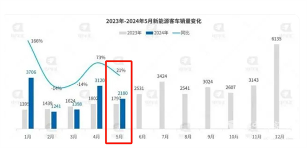 根据终端上牌数据,2024年5月新能源客车销售2180辆,环比下降30.1%,同比增长21%。