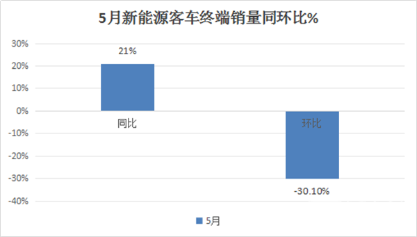 ---今年5月新能源客车终端销量环比下降30.1%,主要是今年4月是”银四”旺季,导致其销量基数较高,因此给今年5月环比增长带来困难。另外就是今年5月我国制造业PMI指数为49.5%,比今年4月的50.4%环比减少0.9个百分点,意味着今年5月国内新能源客车市场需求比4月有减少的趋势。