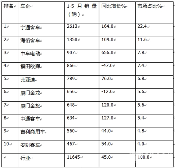 中通\宇通领涨 5月新能源客车终端销量排行出炉
