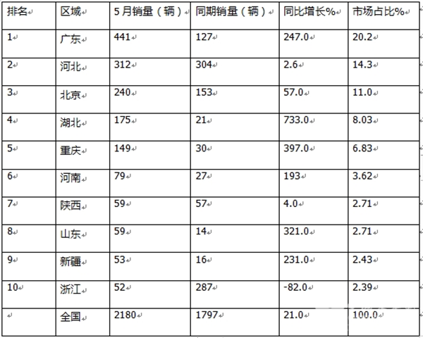 上表显示,在今年1-5月国内新能源客车流向前10个区域市场中: