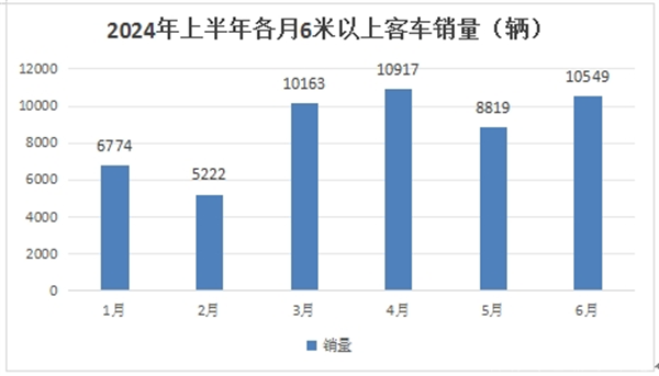 根据中国客车统计信息网数据,2024年1-6月各月6米以上大中型客车销量如下: