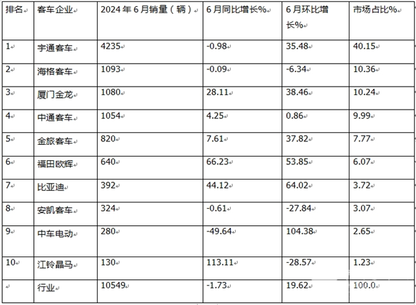 表2,根据中国客车统计信息网数据,2024年6月6米以上客车top10销量排行: