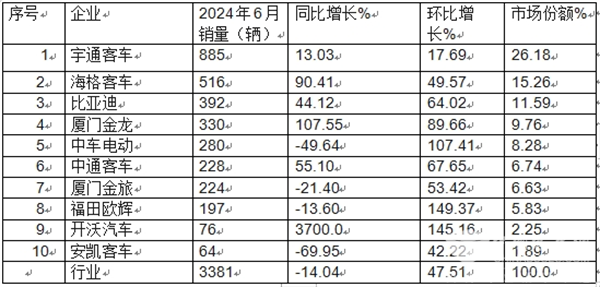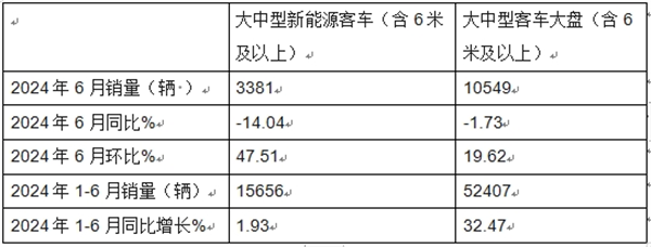表4:2024年6月新能源客车销量同比与客车大盘比较(数据来源:客车统计信息网):