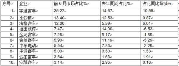 三、上半年:TOP10市场占比同比6增4减,宇通增加最多