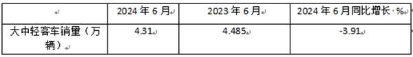 ---2024年6月大中轻客车销量同比2023年6月的4.485万辆下降3.91%,据分析主要是2023年6月销量基数较高,加之今年6月市场景气度相对较差(今年6月我国制造业PMI值是49.5%,低于荣枯线,市场需求不足),两个方面原因的叠加作用,给今年6月客车同比增长带来压力;