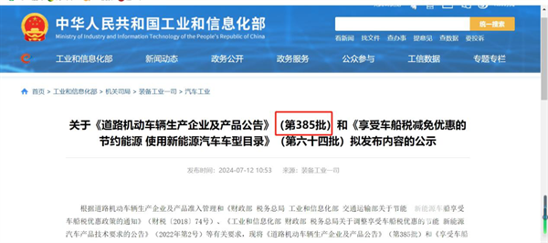 2024年7月12日,工信部发布关于《道路机动车辆生产企业及产品公告》(第385批公告,下也称本批次公告),这是2024年以来工信部发布的第7批汽车新车产品公告。