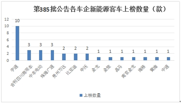 上表可见,本批次公告(第385批)上榜32款新能源客车,居今年以来各批次公告上榜数量第四,说明目前新能源客车市场景气度一般。据分析主要还是目前地方财政缺钱,加之部分大城市已经提前完成了公交客车电动化,因此目前新能源客车市场需求不算太旺。