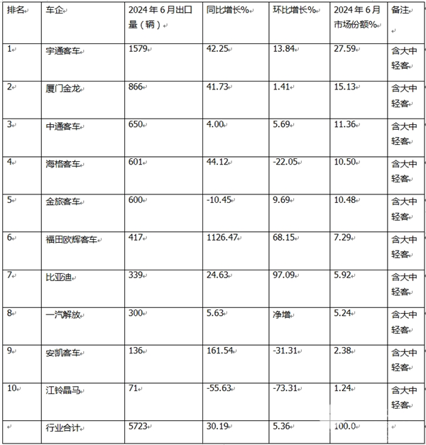 表1,根据中国客车统计信息网数据,2024年6月客车出口TOP10排行: