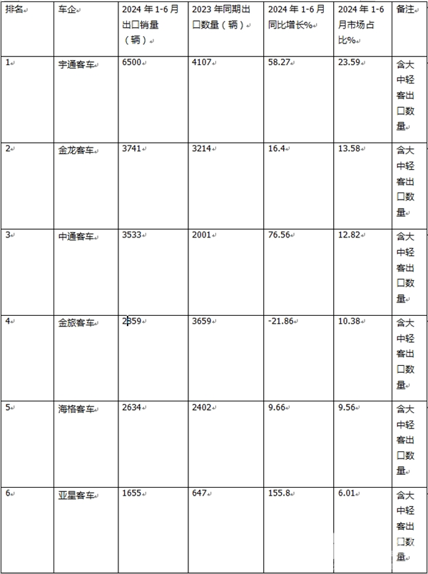 那么2024年6月及上半年我国客车企业出口排行如何?