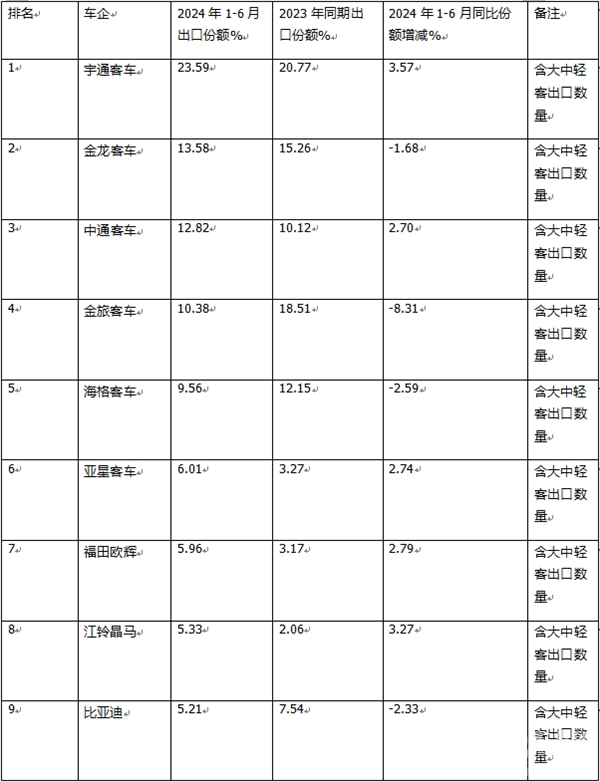 表2,根据中国客车统计信息网数据,2024年1-6月客车企业整体出口TOP10排行(不含轻客出口数量):