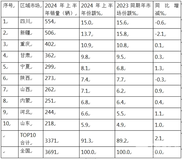 根据终端上牌信息显示,2024年上半年国六天然气客车全国区域销量流向不均衡,主要销往四川、新疆、重庆、甘肃、陕西、新疆、宁夏等气源比较丰富、且加气站网点比较密的区域