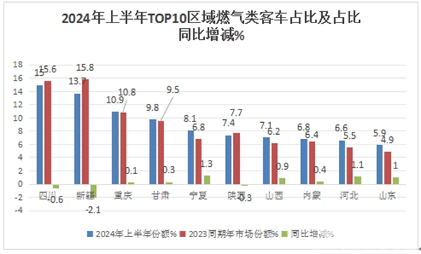 上图表可见,国六天然气客车不像新能源客车那样主要分布在长三角和珠三角等发达地区,而是个“小众市场”,2024年上半年国六天然气客车主要扎堆在天然气资源比较丰富、加气站网点较为密集的四川、新疆、重庆、甘肃、陕西、宁夏等区域。其中四川占比最高,达到15.0%,同比减少个0.6百分点;新疆、重庆分别位居第二和第三,TOP10累计占比超9成(91.3%),且同比增加2.1个百分点,区域市场集中度进一步提高,主要原因是我国天然气资源和加气站分部不均的原因。