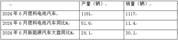 根据中汽协数据,2024年6月燃料电池汽车产量同比统计:
