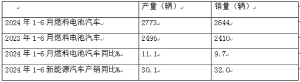上表可见,2024年1-6月燃料电池汽车产销分别为2773辆和2644辆,同比分别增11.1%和9.7%,产销量同比分别跑输2024年前6月新能源汽车产销大盘。