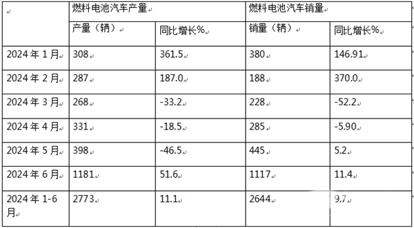 表2,根据中汽协数据,2024年1-6月燃料电池汽车产销同比统计: