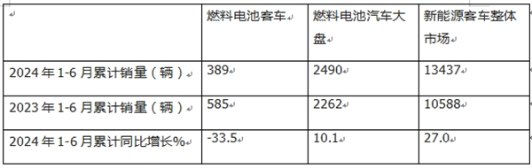 表4,2024年6月及1-6月燃料电池汽车同比与新能源客车大盘比较(数据来源:终端上牌数据)