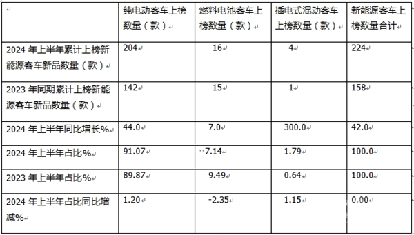 上表可见,今年上半年6个批次公告上榜的各技术路线新能源客车新品中,燃料电池客车占比同比减少2.35个百分点,是占比同比减少最多的细分车型,说明了车企布局燃料电池客车新品的积极性同比减弱比较明显,因此给今年上半年燃料电池客车推广应用的支持力度减弱。而纯电动客车和混动客车上榜数量占比同比均增加,特别是纯电动客车占比同比增加最多,给今年上半年新能源客车整体市场同比增长提供了支持。