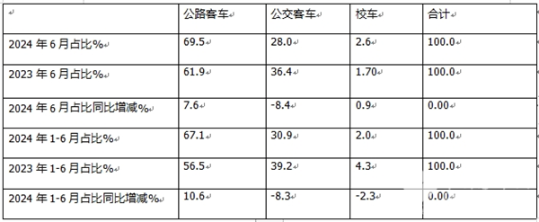 上表可见,在2024年1-6月5米以上公路、公交、校车三大细分市场中: