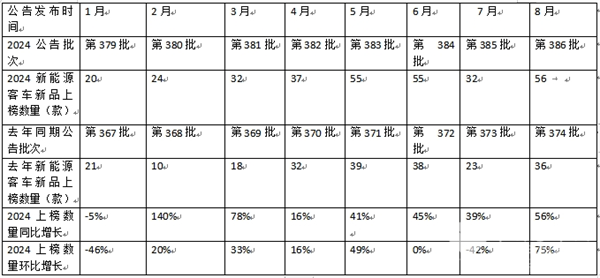 表1,根据工信部数据,2024年1-8月各月新能源客车公告上榜的新品数量及同环比: