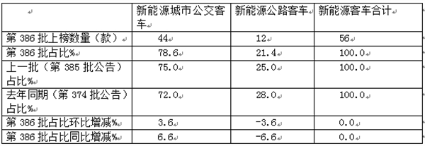 表2,根据工信部数据,第386批公告中上榜的新能源城市客车与新能源公路客车占比及占比同比、环比比较: