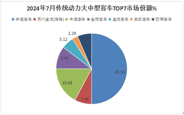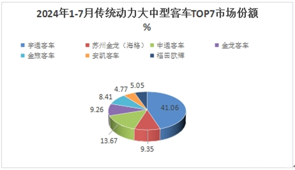 上表可见,2024年1-7月大中型传统动力客车销量同比增长46%,跑赢2024年1-7月大中客大盘25.97%的增幅近20.03个百分点。说明2024年1-7月大中型传统动力的客车市场成为促进今年1-7月大中型客车市场大盘增长的主要力量。