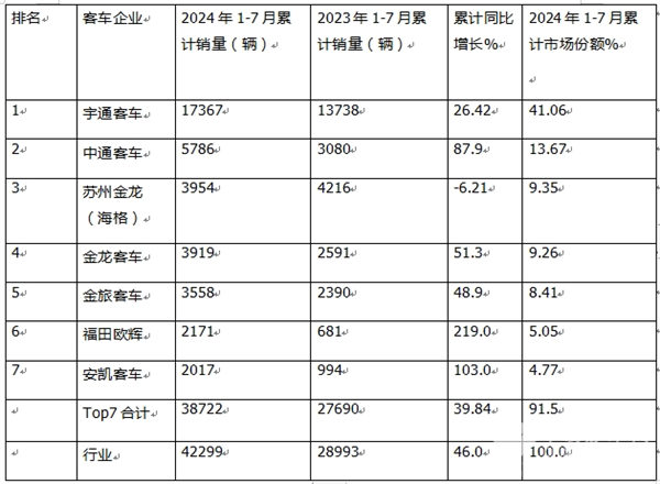 表1,根据中国客车统计信息网数据,2024年7月6米以上传统动力客车销量top7排行(只统计销量在100辆以上车企)