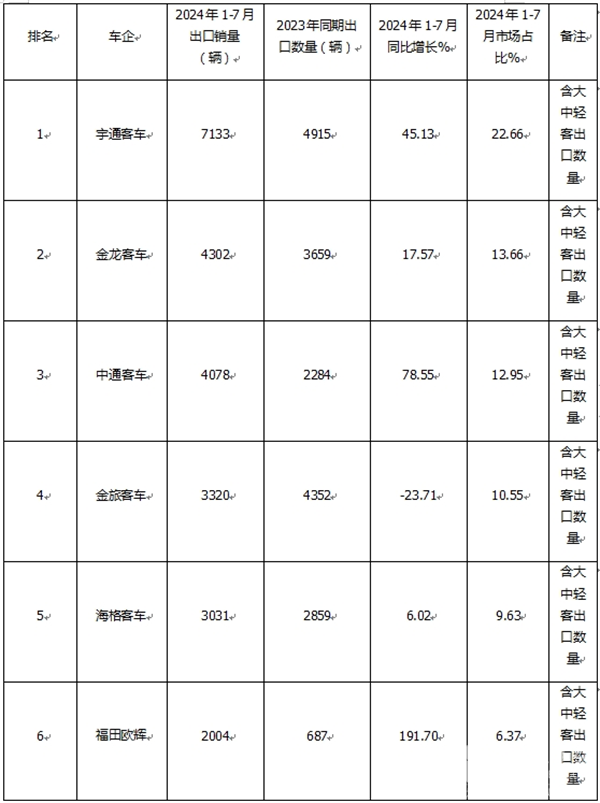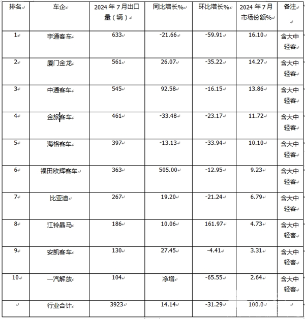 表1,根据中国客车统计信息网数据,2024年7月客车出口TOP10排行: