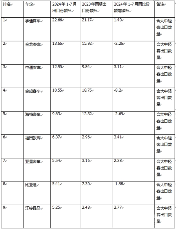 那么2024年7月及1-7月我国客车企业出口排行如何?