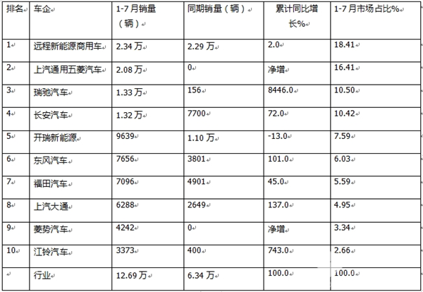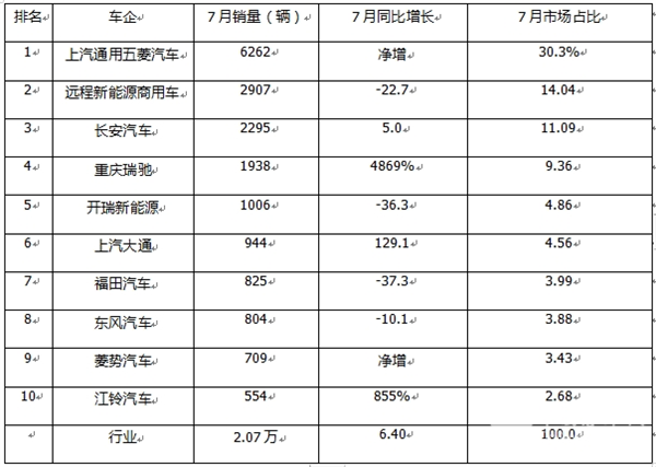 7月新能源轻客:销2.07万辆增64%,五菱\远程\长安居前三