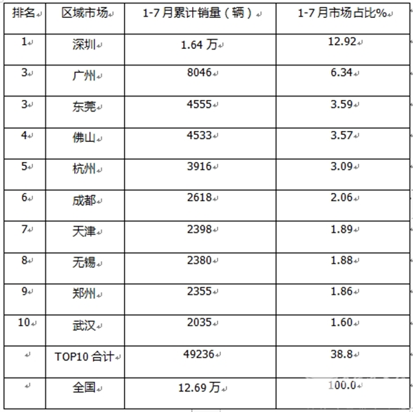 前10座城市累计销售近5万辆(49236辆),累计占比近4成(38.8%),可见今年1-7月我国新能源轻客区域流向很不均衡。