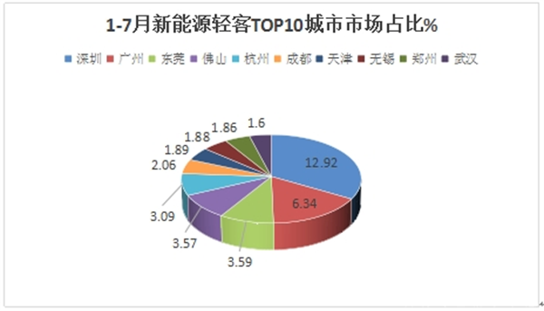 三、1-7月新能源轻客都卖到哪里去了?深圳累销破1.5万辆强势夺冠;广州第二;东莞第三,珠三角是新能源轻客主销区域;TOP10城市累计占比近4成