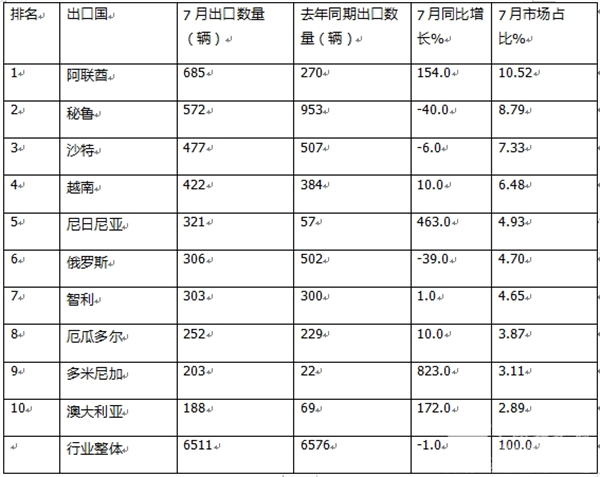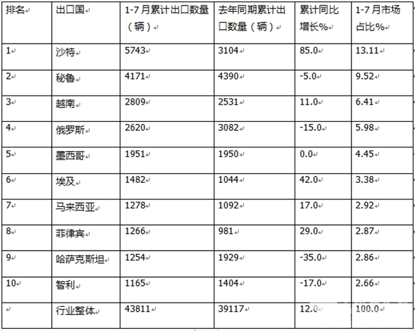 上表显示,2024年7月我国客车出口到TOP10国家中,出口数量同比及市场占比:
