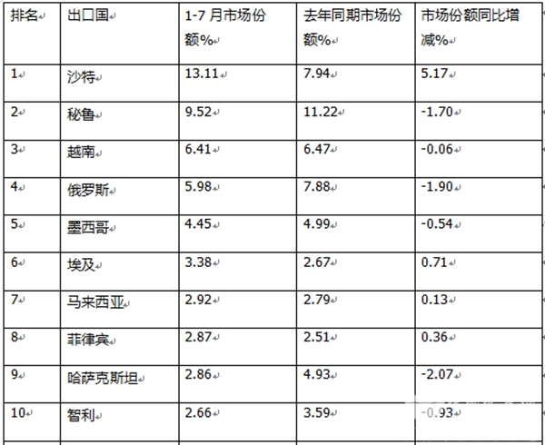 三、前7月累计出口市场份额:TOP10同比增减中4增6减,沙特同比增加最多;俄罗斯同比减少最多