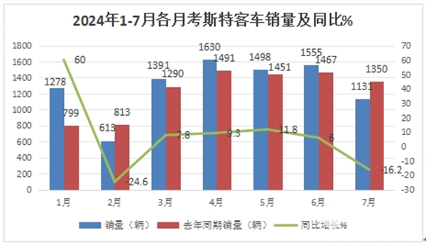 根据终端上牌数据,2024年1-7月各月考斯特客车销量及同比: