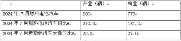 表1,根据中汽协数据,2024年7月燃料电池汽车产量同比统计: