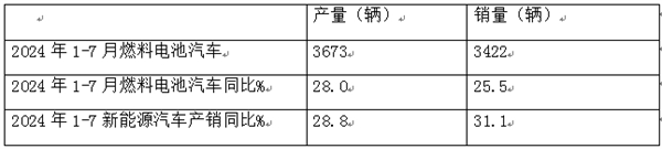 上表可见,2024年1-7月燃料电池汽车产销分别为3673辆和3422辆,同比分别增28%和25.5%,产销量同比分别跑输2024年前7月新能源汽车产销大盘。