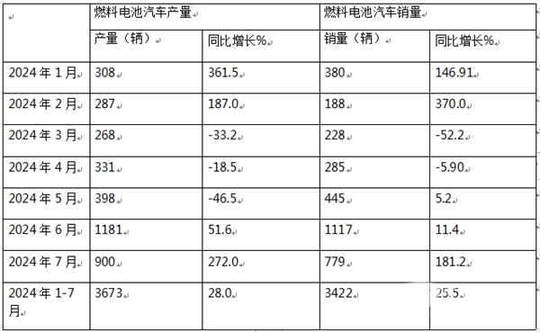 表3,根据中汽协数据,2024年1-7月各月燃料电池汽车产销及同比: