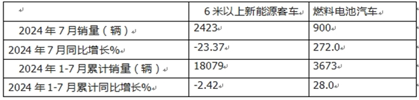 表4,2024年7月及1-7月燃料电池汽车同比与新能源客车大盘比较(数据来源:中国客车统计信息网及中汽协)