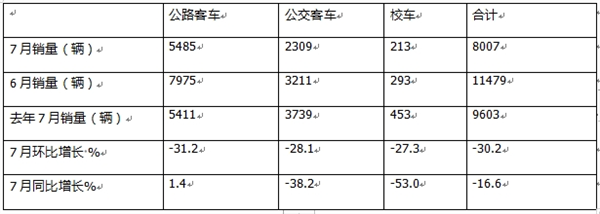 ---销量最大的是公路客车,销量5485辆,同比增长1.4%,也是三大细分市场中同比唯一增长的细分车型,环比下降31.2%,领跌客车大盘,说明今年7月公路客车市场相对6月降温明显,同比增长幅度也很小,增长乏力,市场疲态显现;据分析主要是7月是传统淡季,加之各地高温暴雨较多,影响了旅游市场及人们的正常出行,因此对公路客车需求不旺;