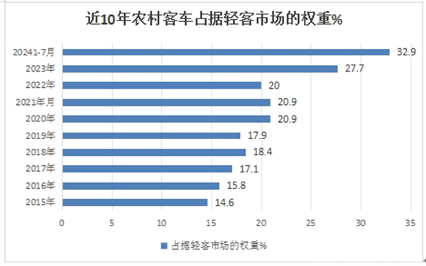 上图表可见,在2024年前7月,农村客车占据轻客市场的比例为32.9%,占比超3成,创近10年新高。这也是今年1-7月农村客车市场一个看点。具体原因除上文已经简析。